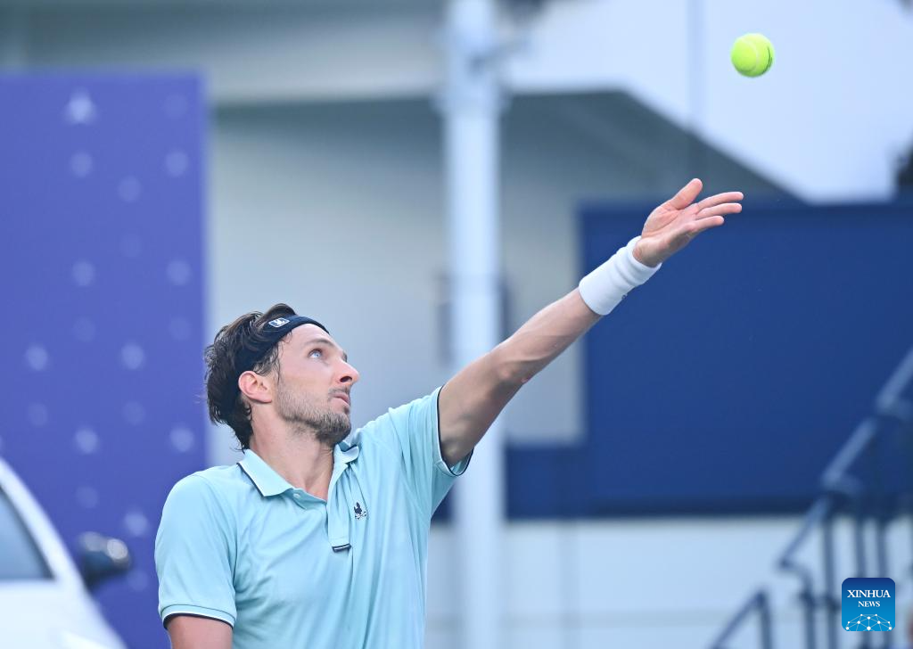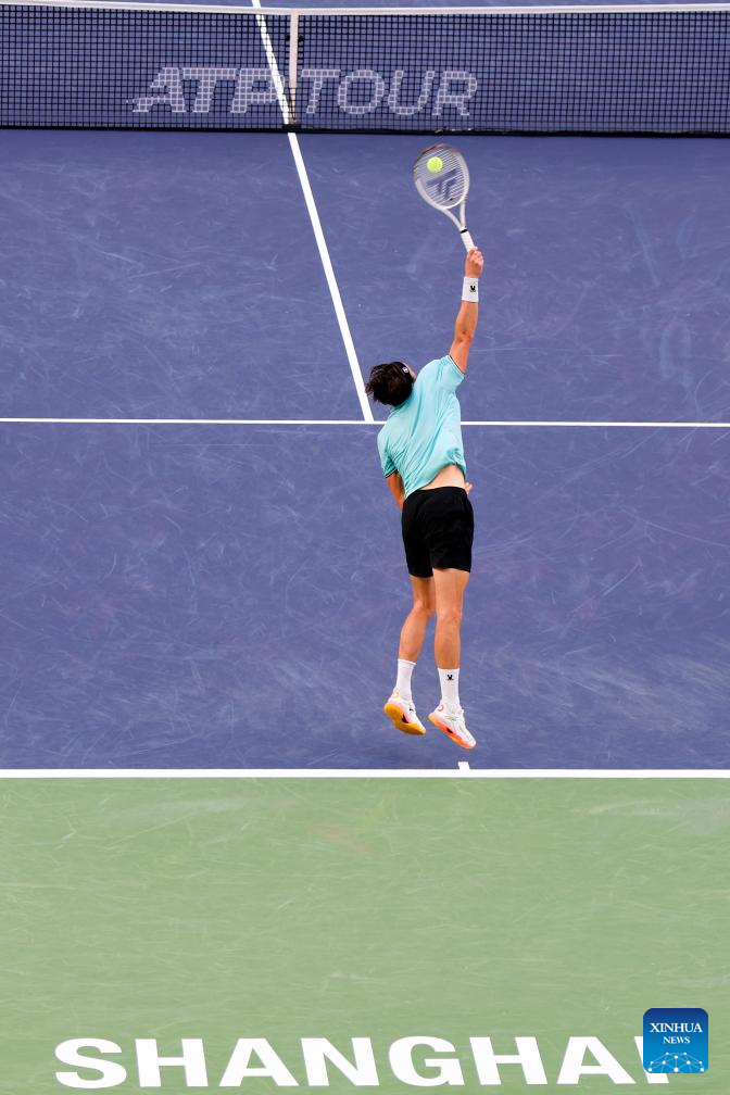 Arthur Rinderknech of France serves to Felix Auger-Aliassime of Canada during the men's singles quarterfinal at the ATP World Tour Shanghai Masters tennis tournament in Shanghai, east China, Oct. 10, 2025. (Xinhua/Chen Haoming)