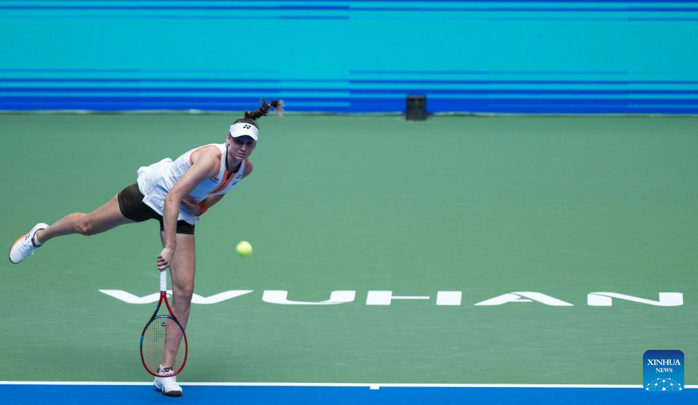 Elena Rybakina serves during the women's singles quarterfinal match between Elena Rybakina of Kazakhstan and Aryna Sabalenka of Belarus at the 2025 Wuhan Open tennis tournament in Wuhan, central China's Hubei Province, Oct. 10, 2025. (Xinhua/Wu Zhizun)