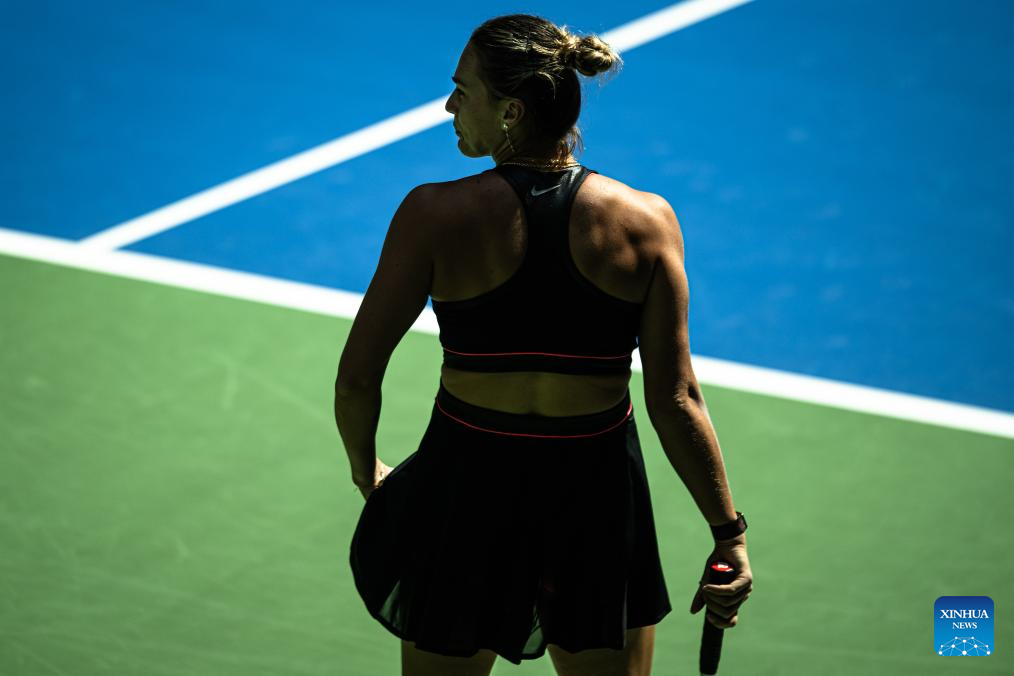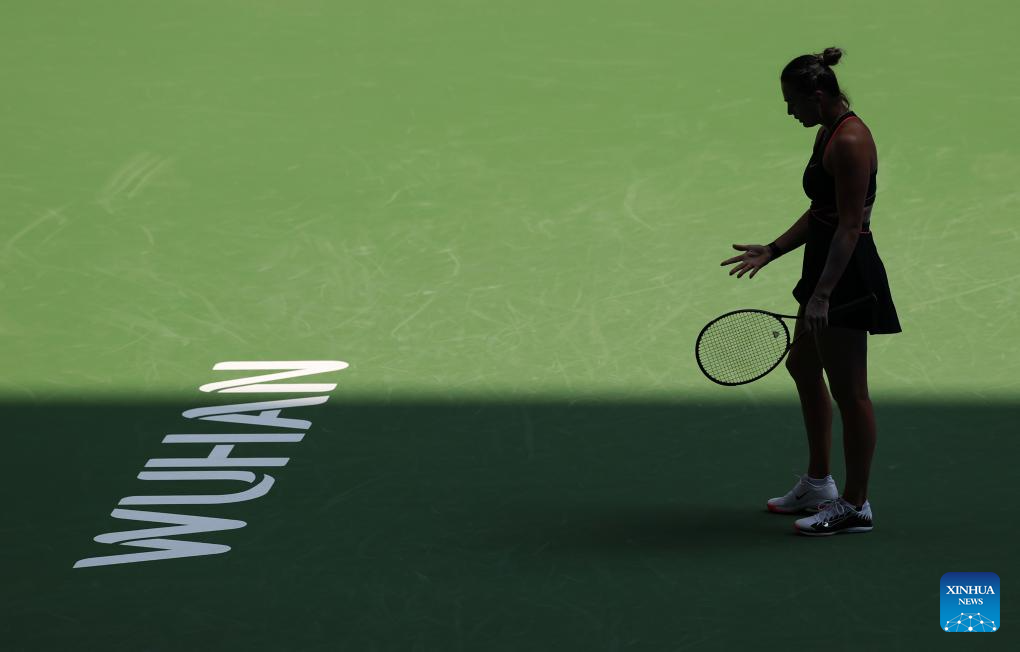 Aryna Sabalenka reacts during the women's singles quarterfinal match between Elena Rybakina of Kazakhstan and Aryna Sabalenka of Belarus at the 2025 Wuhan Open tennis tournament in Wuhan, central China's Hubei Province, Oct. 10, 2025. (Xinhua/Bai Xuefei)