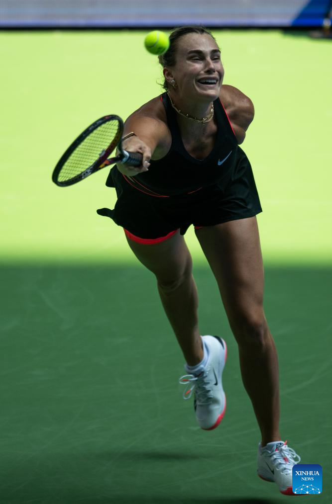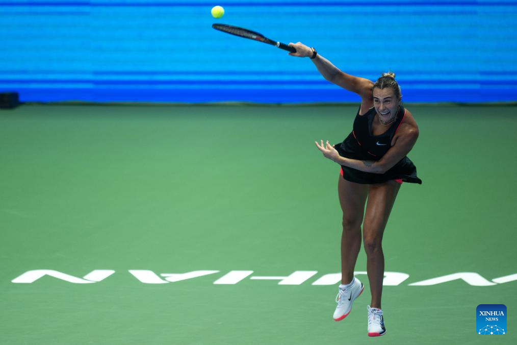 Aryna Sabalenka hits a return during the women's singles quarterfinal match between Elena Rybakina of Kazakhstan and Aryna Sabalenka of Belarus at the 2025 Wuhan Open tennis tournament in Wuhan, central China's Hubei Province, Oct. 10, 2025. (Xinhua/Xiao Yijiu)