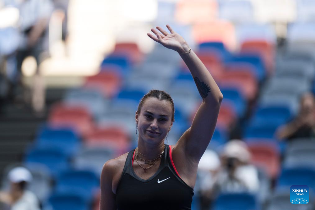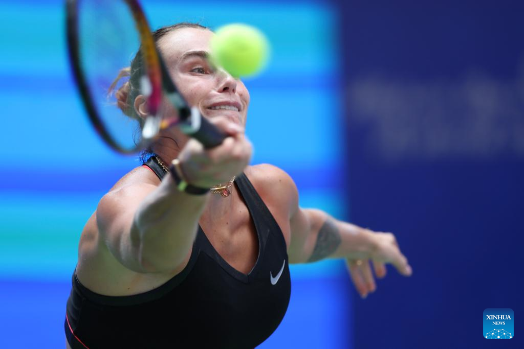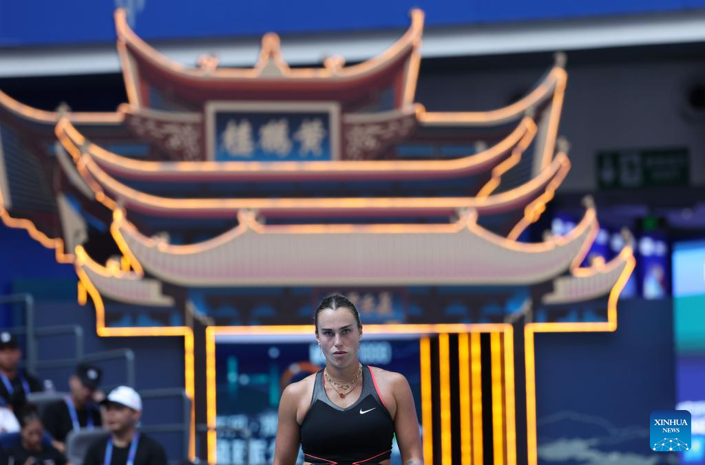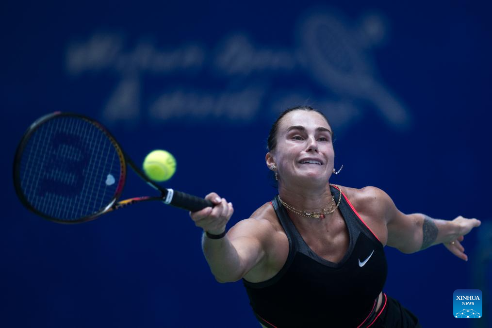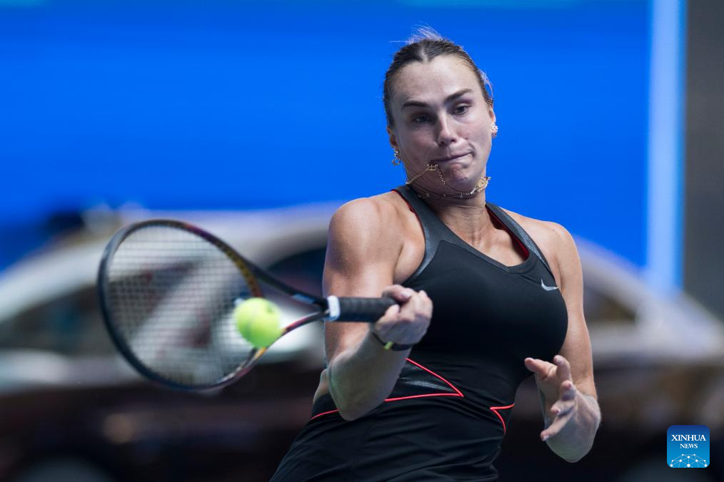 Aryna Sabalenka hits a return during the women's singles quarterfinal match between Elena Rybakina of Kazakhstan and Aryna Sabalenka of Belarus at the 2025 Wuhan Open tennis tournament in Wuhan, central China's Hubei Province, Oct. 10, 2025. (Xinhua/Wu Zhizun)
