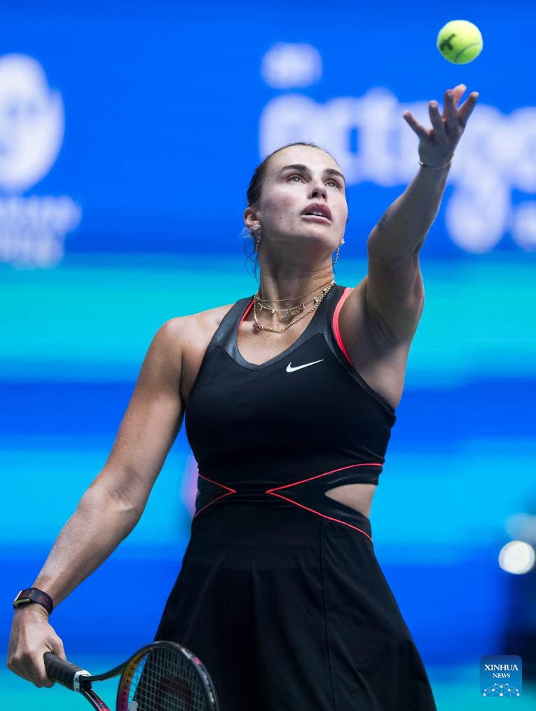 Aryna Sabalenka serves during the women's singles quarterfinal match between Elena Rybakina of Kazakhstan and Aryna Sabalenka of Belarus at the 2025 Wuhan Open tennis tournament in Wuhan, central China's Hubei Province, Oct. 10, 2025. (Xinhua/Wu Zhizun)