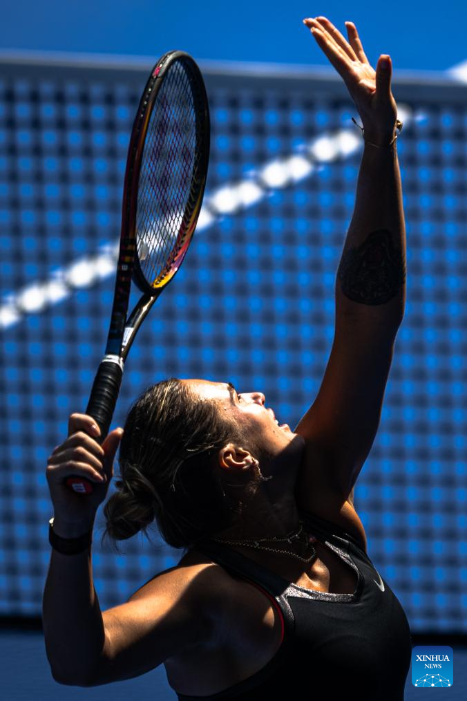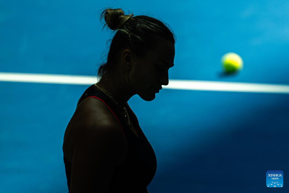 Aryna Sabalenka reacts during the women's singles quarterfinal match between Elena Rybakina of Kazakhstan and Aryna Sabalenka of Belarus at the 2025 Wuhan Open tennis tournament in Wuhan, central China's Hubei Province, Oct. 10, 2025. (Xinhua/Xiao Yijiu)