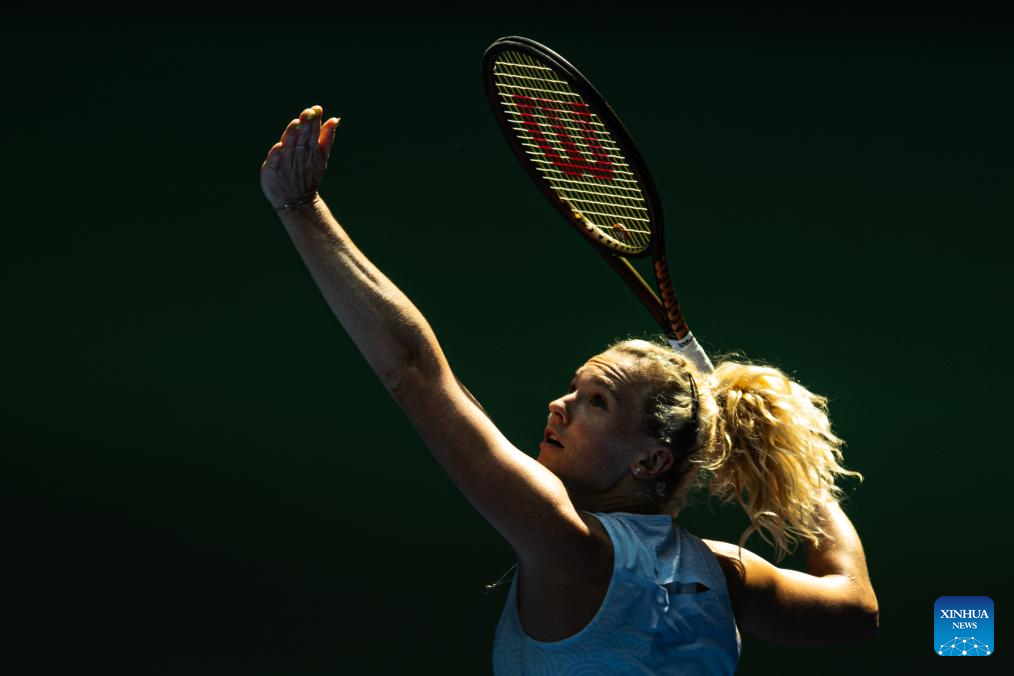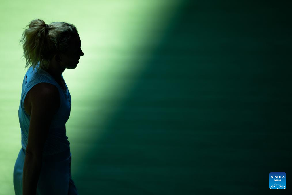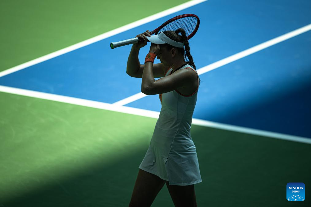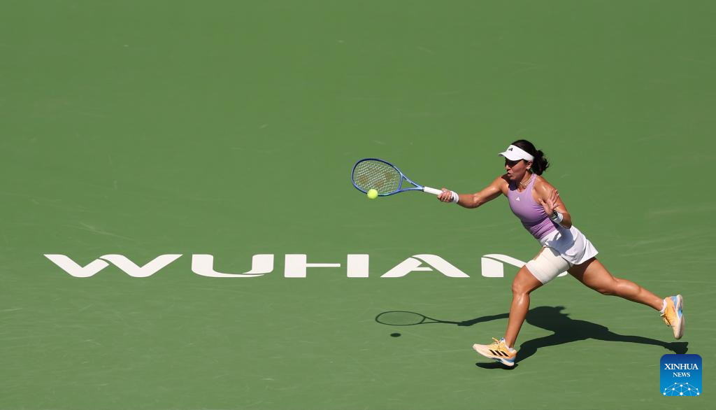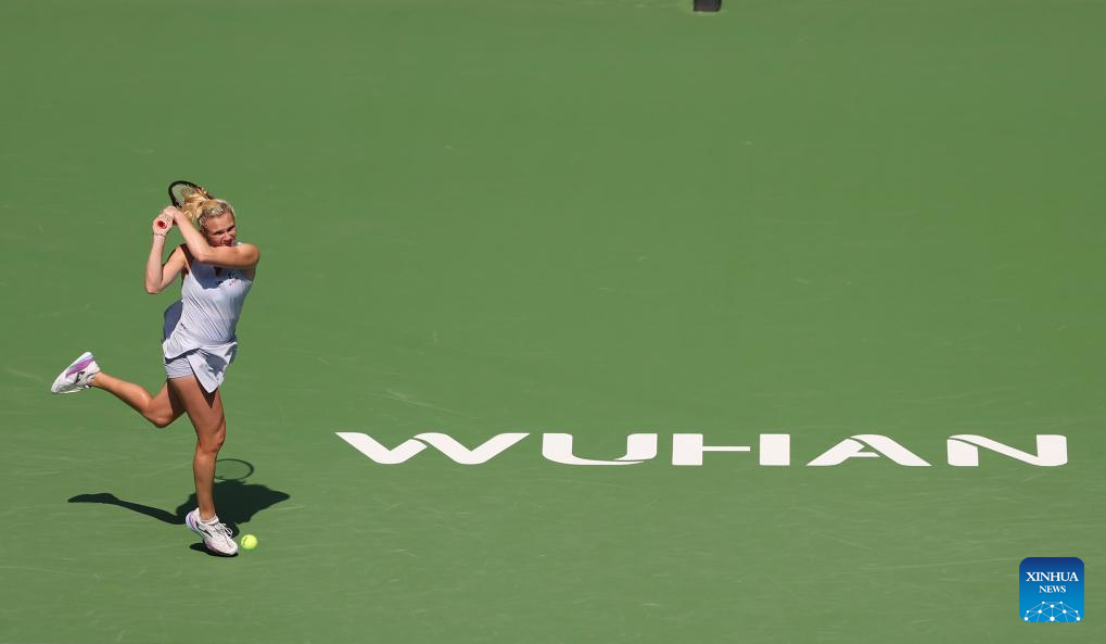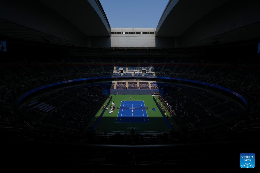 Photo taken on Oct. 10, 2025 shows the women's singles quarterfinal match between Jessica Pegula of the United States and Katerina Siniakova of the Czech Republic at the 2025 Wuhan Open tennis tournament in Wuhan, central China's Hubei Province. (Xinhua/Bai Xuefei)