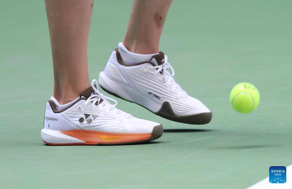 Photo taken on Oct. 10, 2025 shows Elena Rybakina's shoes with her name during the women's singles quarterfinal match between Elena Rybakina of Kazakhstan and Aryna Sabalenka of Belarus at the 2025 Wuhan Open tennis tournament in Wuhan, central China's Hubei Province. (Xinhua/Bai Xuefei)