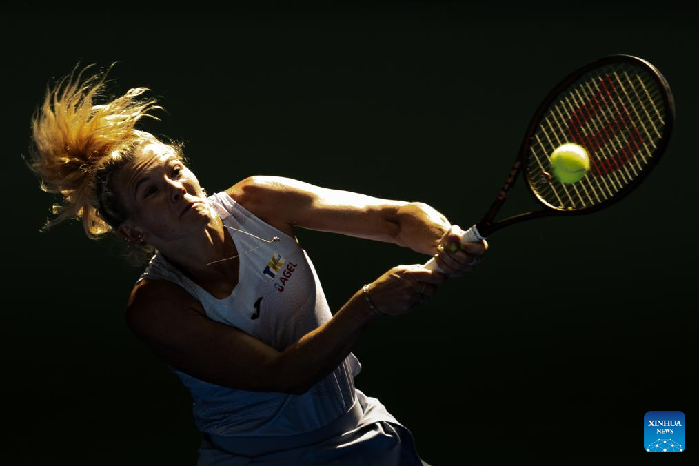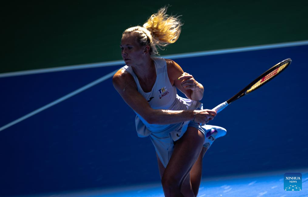 Katerina Siniakova of the Czech Republic hits a return during the women's singles quarterfinal match against Jessica Pegula of the United States at the 2025 Wuhan Open tennis tournament in Wuhan, central China's Hubei Province, Oct. 10, 2025. (Xinhua/Bai Xuefei)