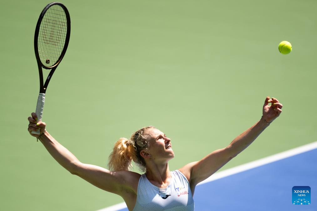 Katerina Siniakova of the Czech Republic serves during the women's singles quarterfinal match against Jessica Pegula of the United States at the 2025 Wuhan Open tennis tournament in Wuhan, central China's Hubei Province, Oct. 10, 2025. (Xinhua/Xiao Yijiu)