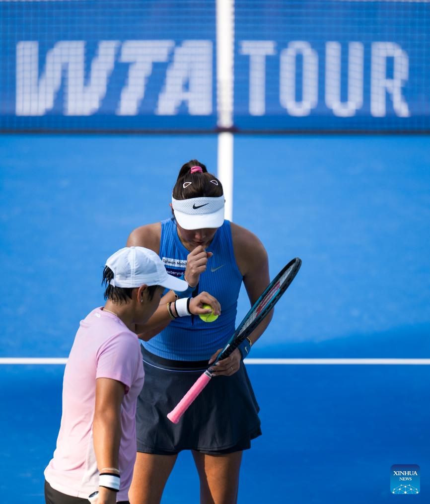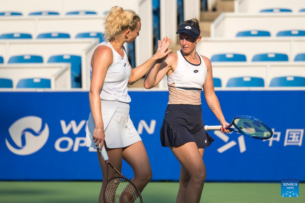 Chan Hao-Ching (R)/Jiang Xinyu communicate with each other during the women's doubles quarterfinal between Chan Hao-Ching (Chinese Taipei)/Jiang Xinyu (China) and Storm Hunter (Australia)/Katerina Siniakova (the Czech Republic) at the 2025 Wuhan Open tennis tournament in Wuhan, central China's Hubei Province, Oct. 10, 2025. (Xinhua/Wu Zhizun)