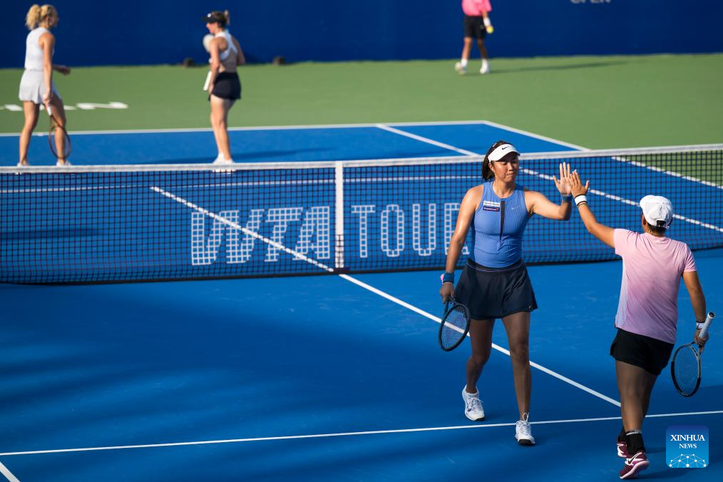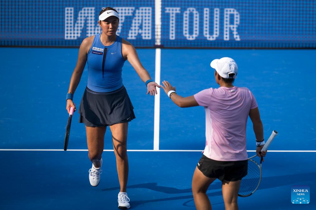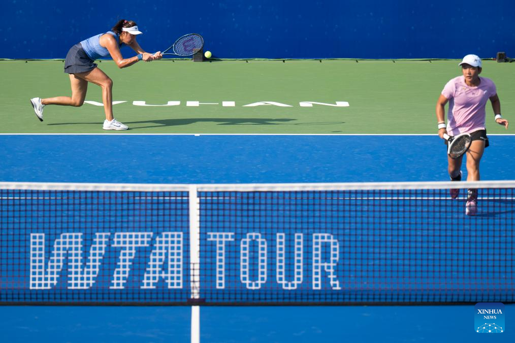 Chan Hao-Ching (L)/Jiang Xinyu compete during the women's doubles quarterfinal between Chan Hao-Ching (Chinese Taipei)/Jiang Xinyu (China) and Storm Hunter (Australia)/Katerina Siniakova (the Czech Republic) at the 2025 Wuhan Open tennis tournament in Wuhan, central China's Hubei Province, Oct. 10, 2025. (Xinhua/Wu Zhizun)