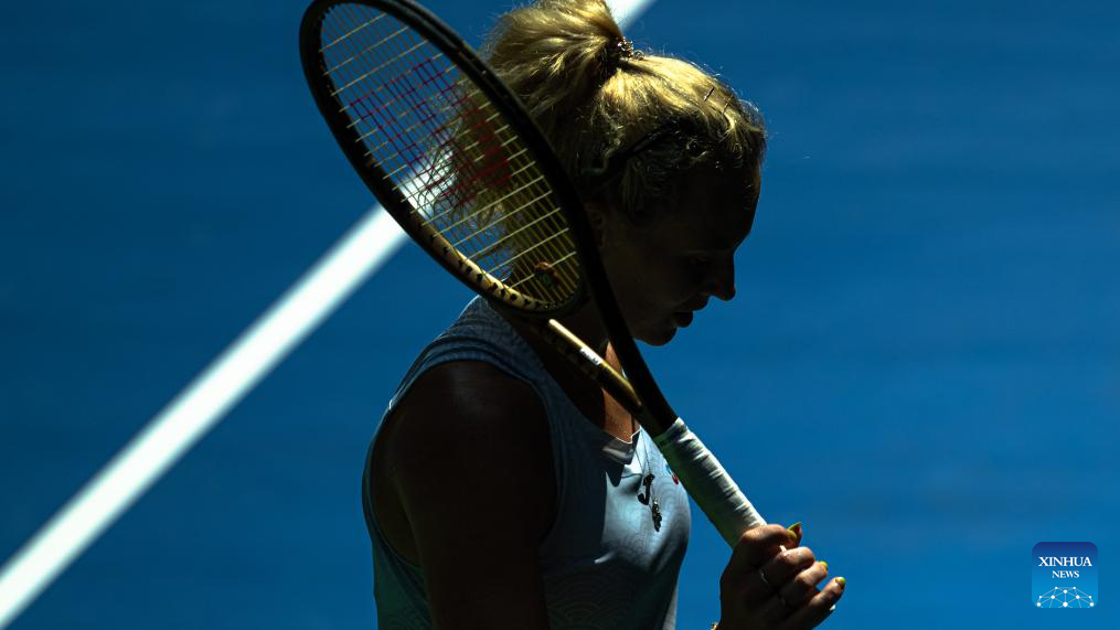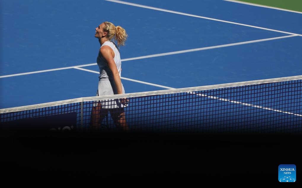 Katerina Siniakova of the Czech Republic reacts during the women's singles quarterfinal match against Jessica Pegula of the United States at the 2025 Wuhan Open tennis tournament in Wuhan, central China's Hubei Province, Oct. 10, 2025. (Xinhua/Bai Xuefei)