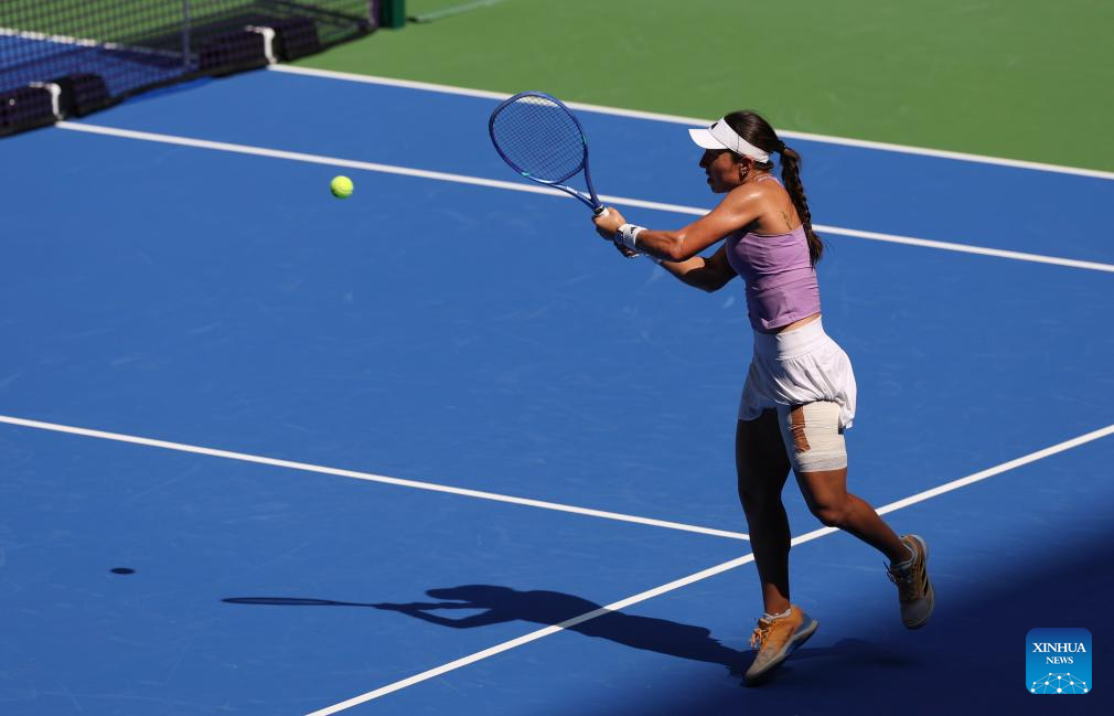 Jessica Pegula of the United States hits a return during women's singles quarterfinal match against Katerina Siniakova of the Czech Republic at the 2025 Wuhan Open tennis tournament in Wuhan, central China's Hubei Province, Oct. 10, 2025. (Xinhua/Bai Xuefei)