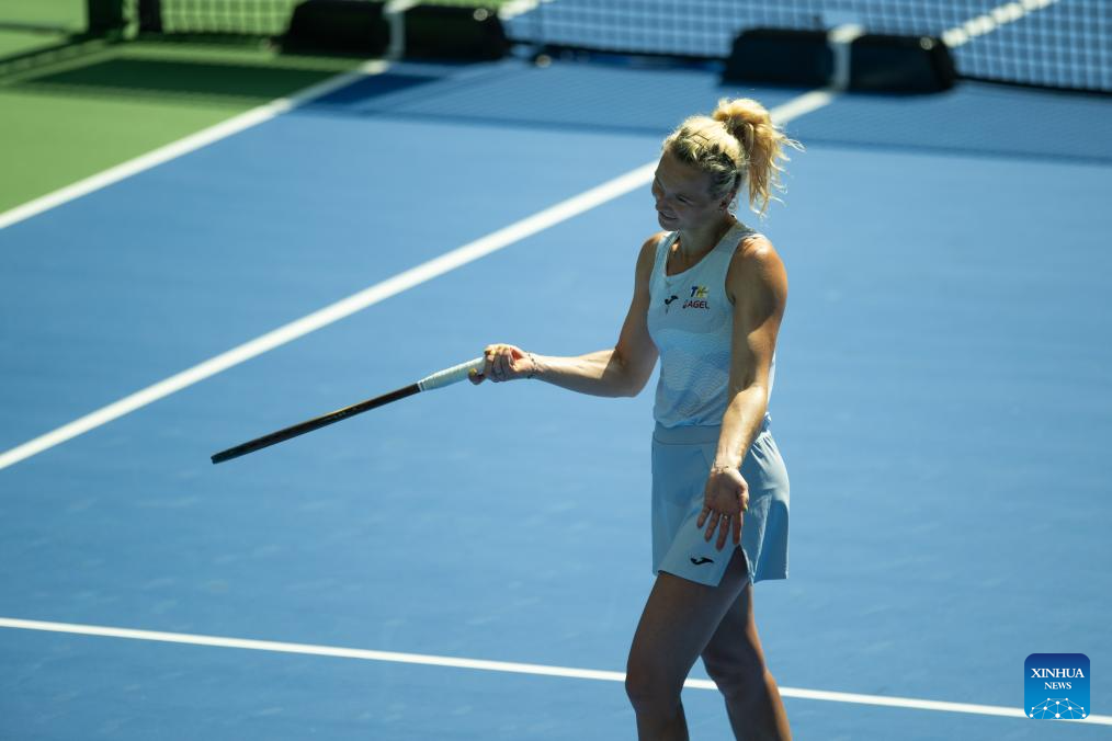 Katerina Siniakova of the Czech Republic reacts during the women's singles quarterfinal match against Jessica Pegula of the United States at the 2025 Wuhan Open tennis tournament in Wuhan, central China's Hubei Province, Oct. 10, 2025. (Xinhua/Xiao Yijiu)