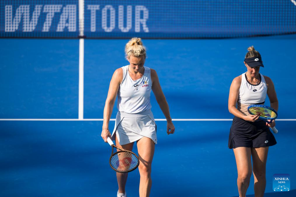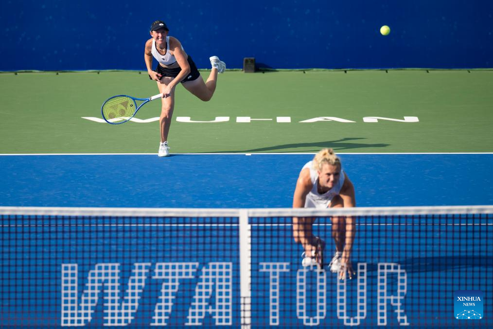 Storm Hunter (L)/Katerina Siniakova compete during the women's doubles quarterfinal between Chan Hao-Ching (Chinese Taipei)/Jiang Xinyu (China) and Storm Hunter (Australia)/Katerina Siniakova (the Czech Republic) at the 2025 Wuhan Open tennis tournament in Wuhan, central China's Hubei Province, Oct. 10, 2025. (Xinhua/Wu Zhizun)