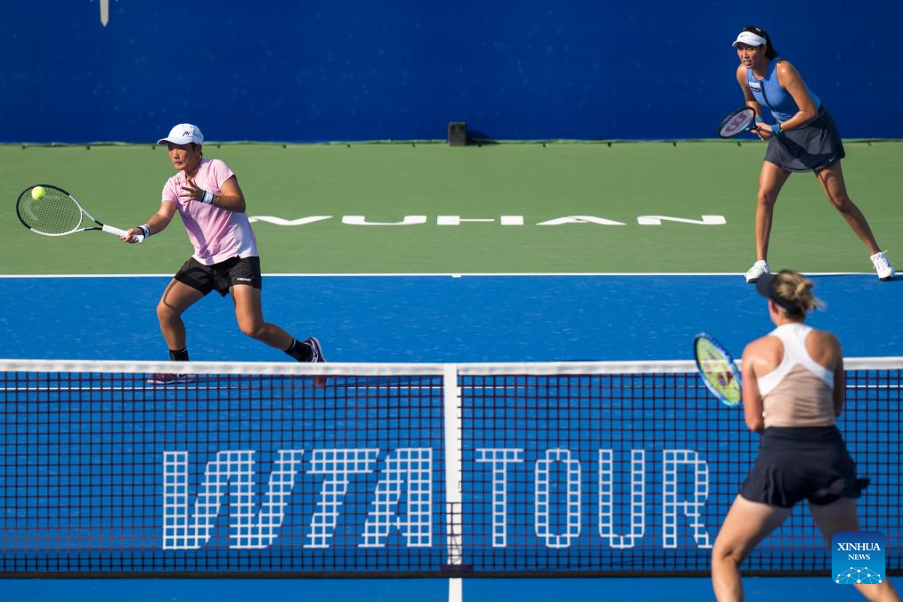 Chan Hao-Ching (top R)/Jiang Xinyu (L) compete during the women's doubles quarterfinal between Chan Hao-Ching (Chinese Taipei)/Jiang Xinyu (China) and Storm Hunter (Australia)/Katerina Siniakova (the Czech Republic) at the 2025 Wuhan Open tennis tournament in Wuhan, central China's Hubei Province, Oct. 10, 2025. (Xinhua/Wu Zhizun)
