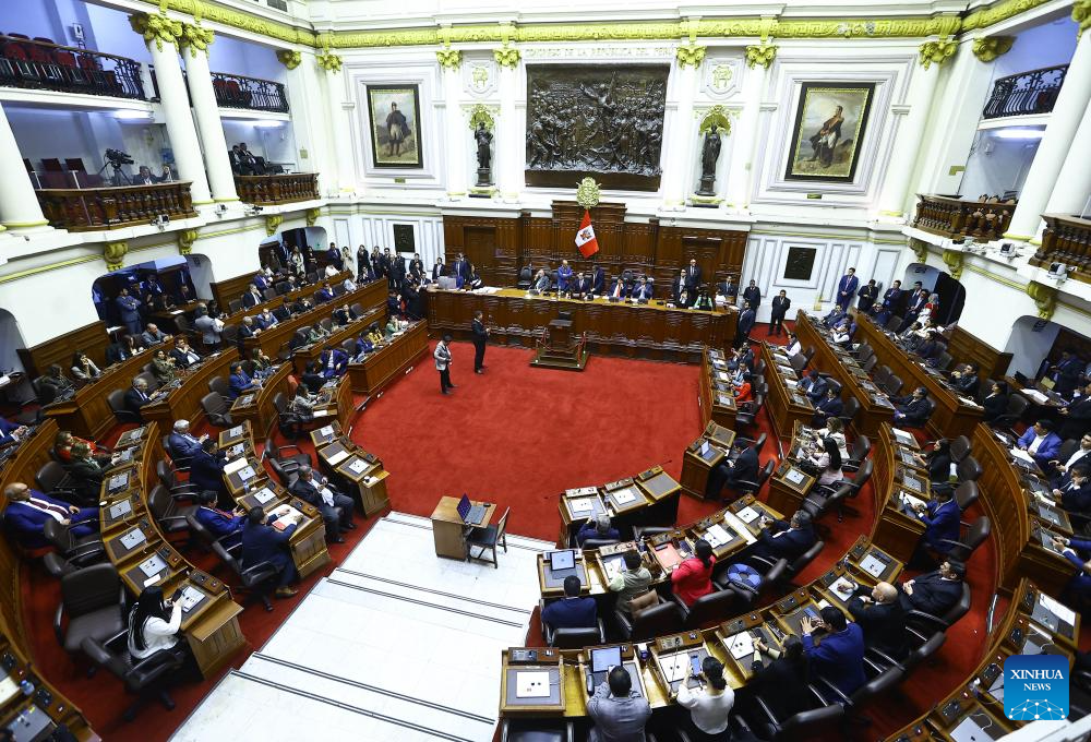 Peru's lawmakers demanded then President Dina Boluarte appear at the Congress session to defend herself before voting to approve her impeachment on Thursday night. But Boluarte did not attend the meeting. The Congress passed the impeachment against her shortly afterwards. (Peru's Congress/Handout via Xinhua)