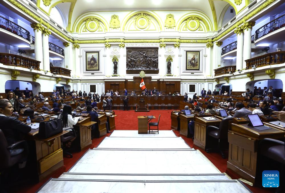 A session is held at Peru's Congress in Lima, Peru, on Oct. 9, 2025. Peru's lawmakers demanded then President Dina Boluarte appear at the Congress session to defend herself before voting to approve her impeachment on Thursday night. But Boluarte did not attend the meeting. The Congress passed the impeachment against her shortly afterwards. (Peru's Congress/Handout via Xinhua)