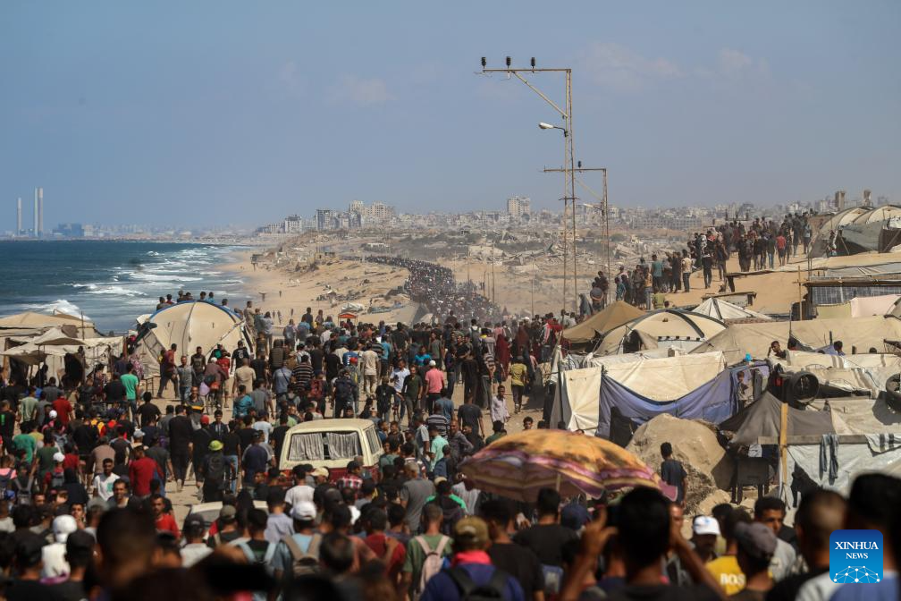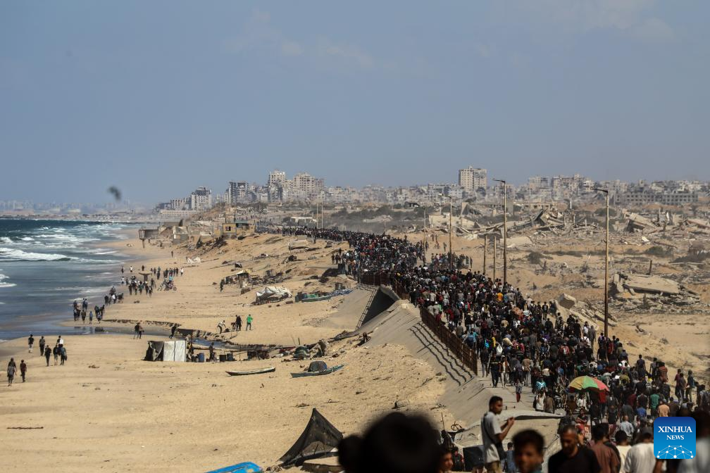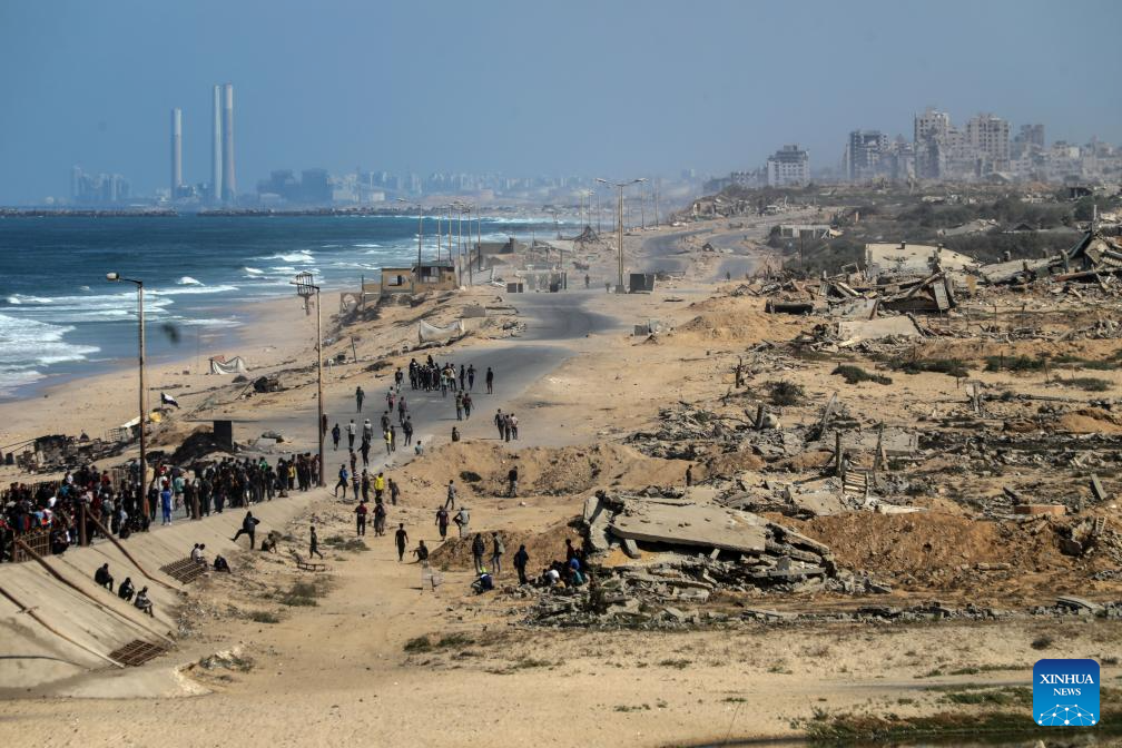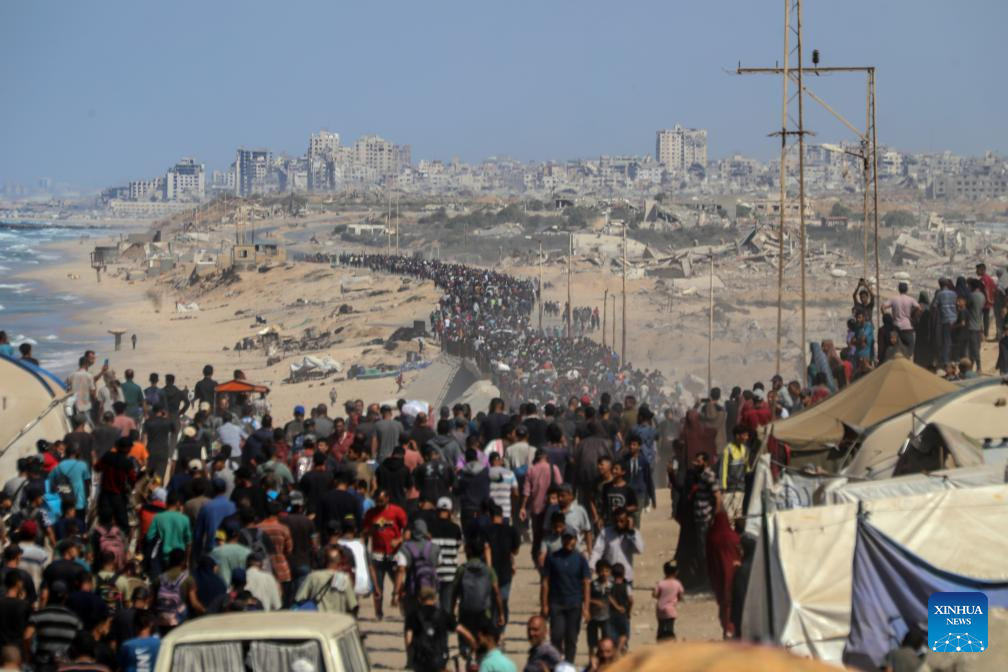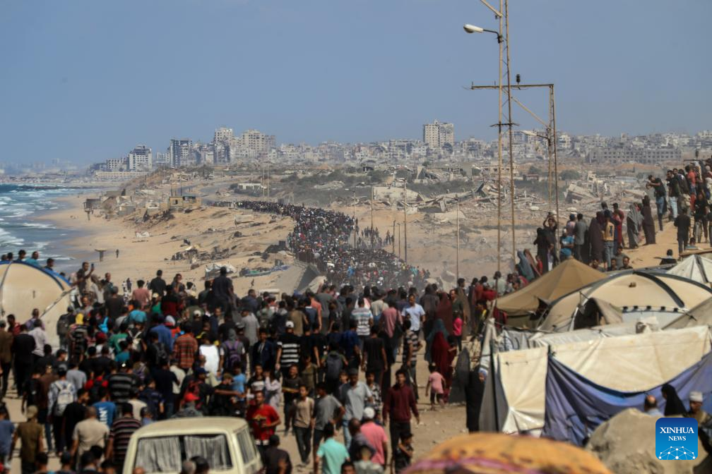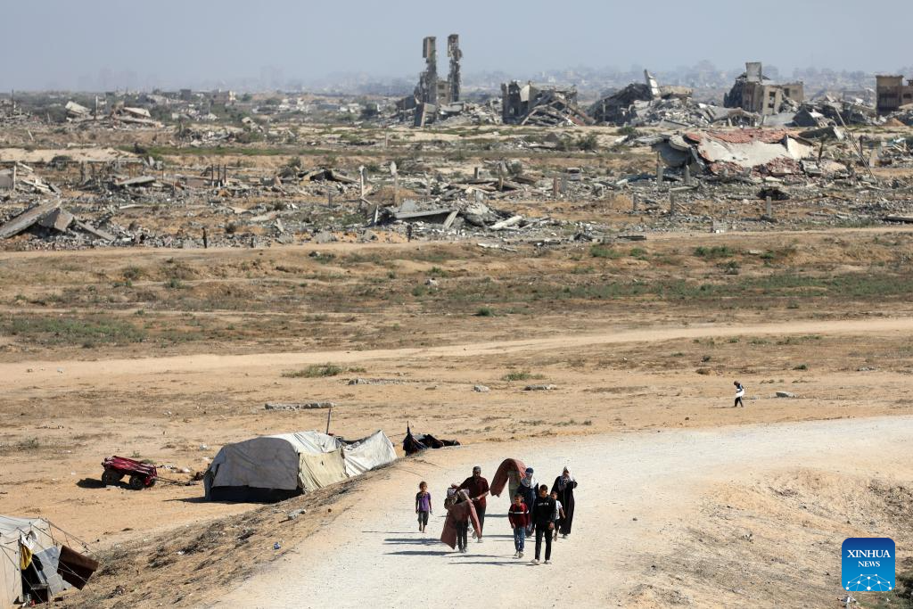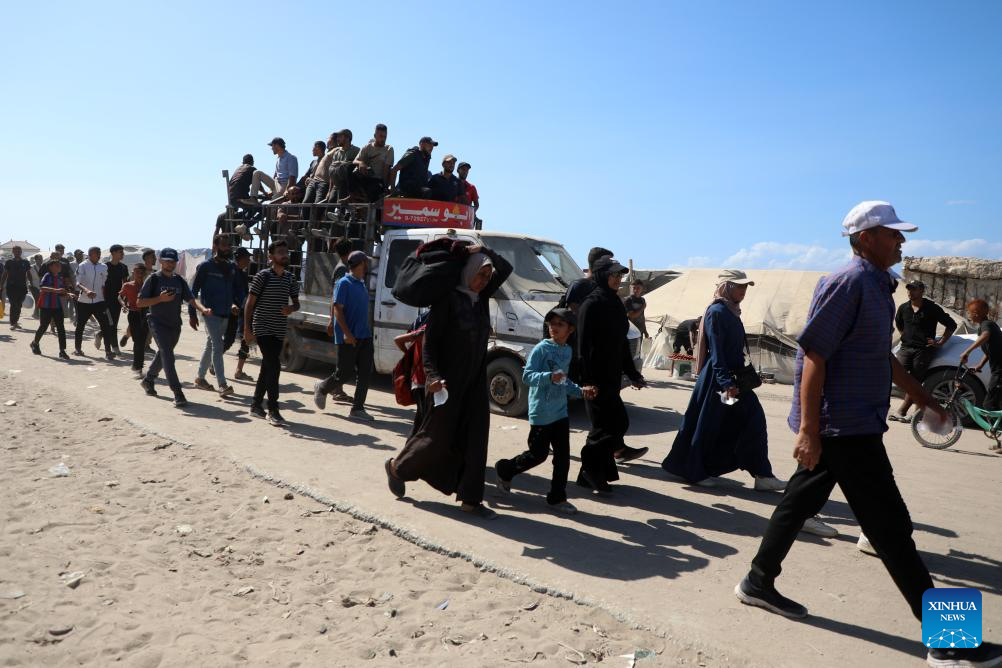 GAZA/JERUSALEM, Oct. 10 (Xinhua) -- Displaced Palestinians have begun returning from the southern part of the Gaza Strip to the north after the Israeli army announced that civilians are permitted to move through the coastal Rashid Road and Salah al-Din Road, local sources said on Friday.