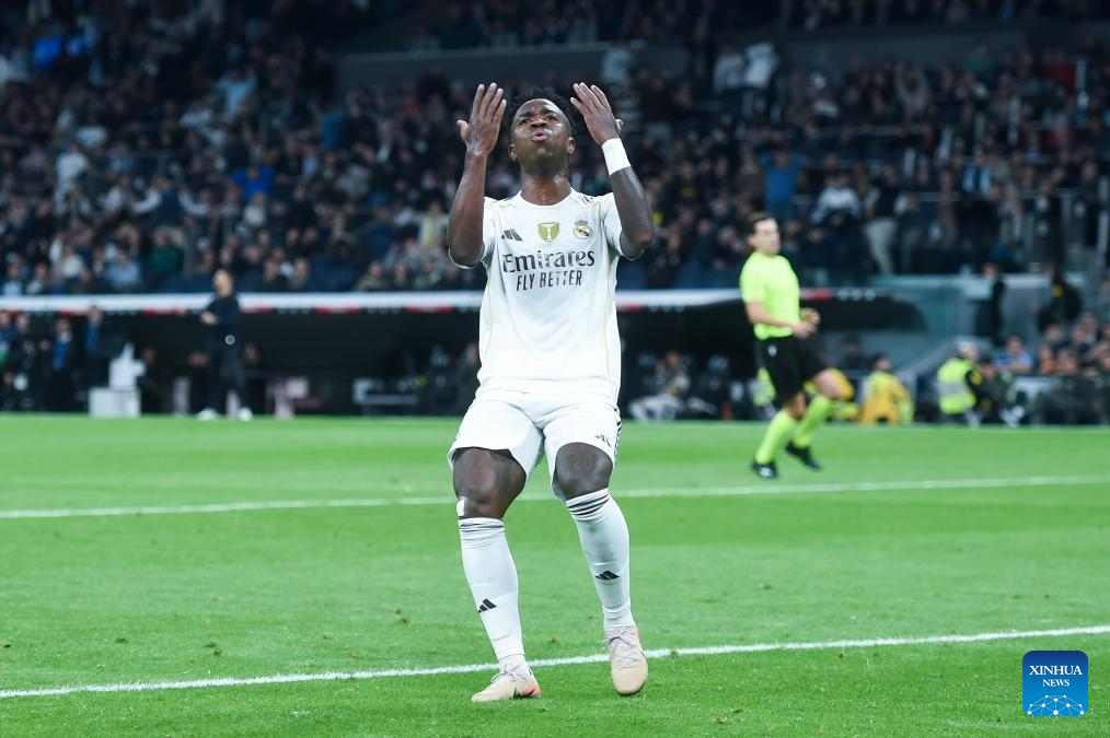 Madrid's Vinicius Junior reacts during a La Liga football match between Real Madrid and Celta Vigo at Santiago Bernabeu stadium in Madrid, Spain, on Dec. 7, 2025. (Photo by Gustavo Valiente/Xinhua)