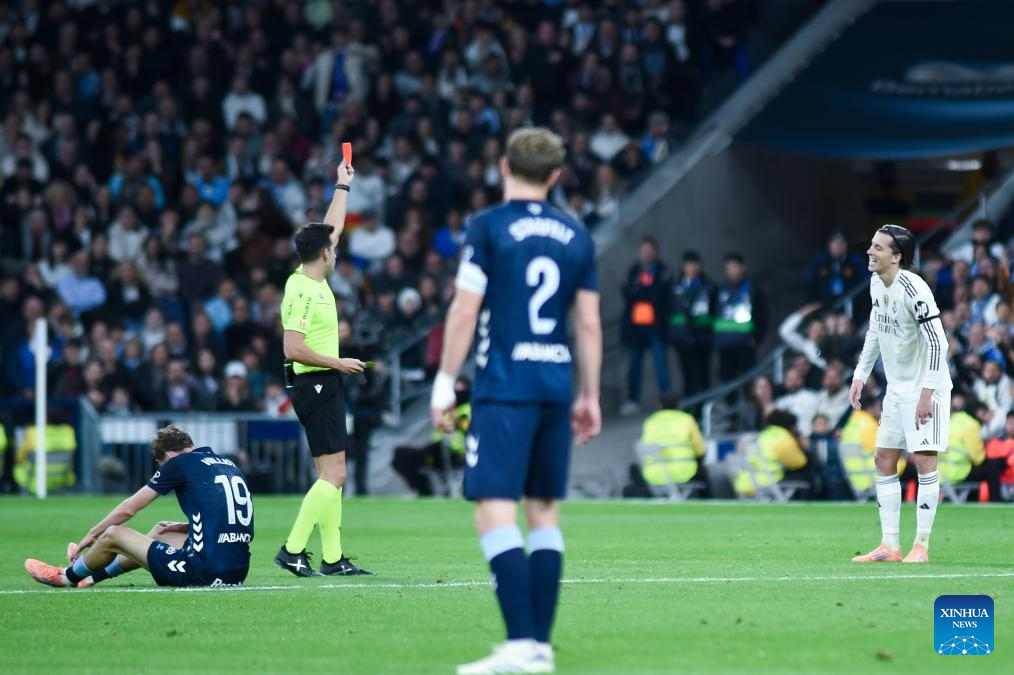 Real Madrid's Alvaro Carreras (R) is given a red card during a La Liga football match between Real Madrid and Celta Vigo at Santiago Bernabeu stadium in Madrid, Spain, on Dec. 7, 2025. (Photo by Gustavo Valiente/Xinhua)