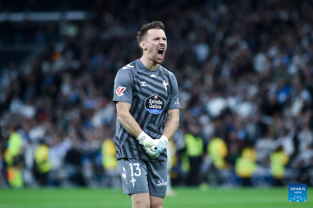 Celta Vigo's goalkeeper Andrei Radu celebrates a goal during a La Liga football match between Real Madrid and Celta Vigo at Santiago Bernabeu stadium in Madrid, Spain, on Dec. 7, 2025. (Photo by Gustavo Valiente/Xinhua)