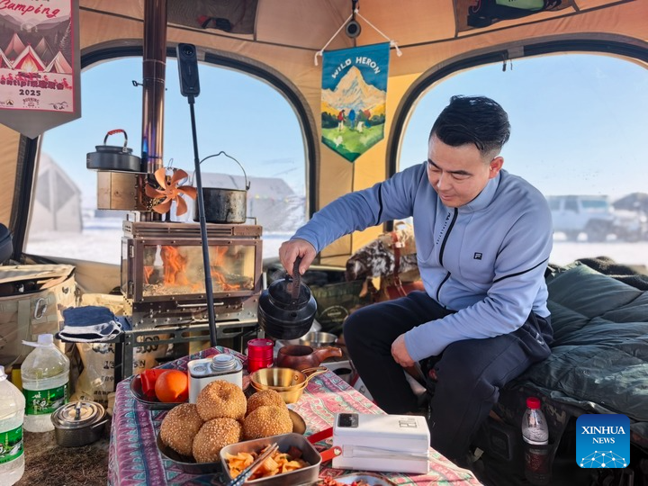 A camper enjoys tea and food inside a tent during the 4th Northeast Camping Carnival in Hala village in the Meilisi Daur Ethnic District of Qiqihar, northeast China's Heilongjiang Province, Jan. 13, 2026. (Xinhua/Zhang Yue)