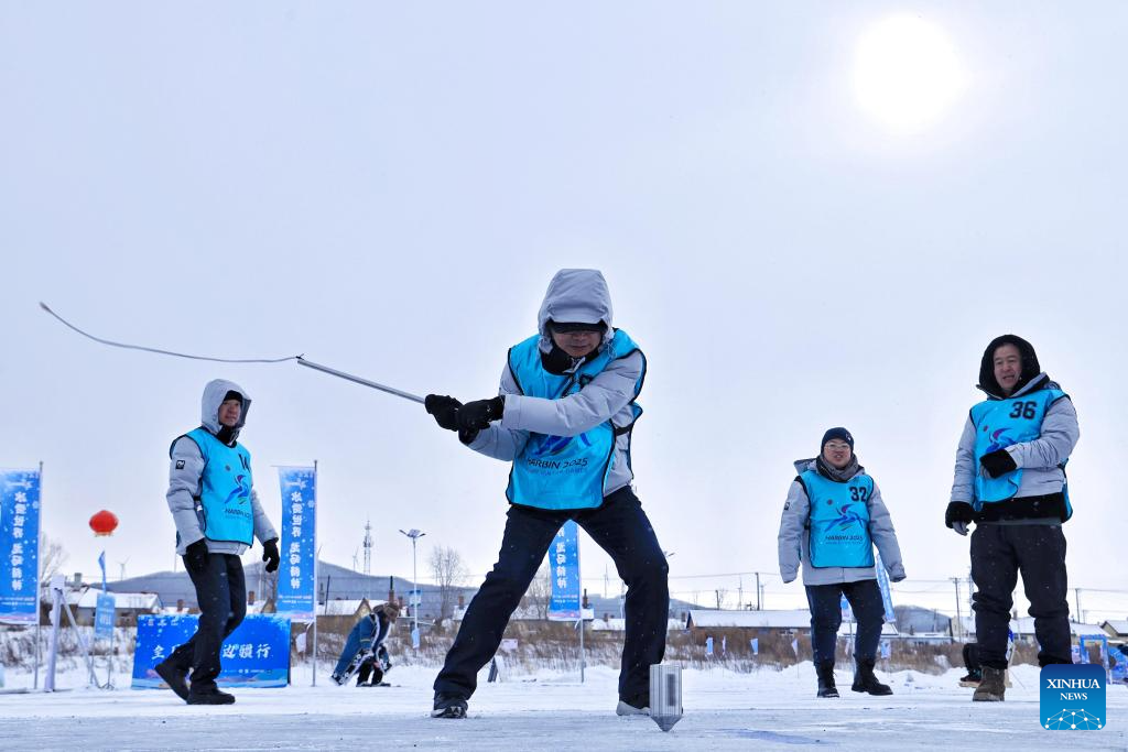 People of the Hezhe ethnic group participate in a folk sport during a winter fishing festival in Jiejinkou Hezhe Ethnic Township, Tongjiang City, northeast China's Heilongjiang Province, on Jan. 23, 2026. The event, held on a frozen lake, is part of the province's winter fishing events. It integrates traditional Hezhe fishing and hunting culture with folk sports, offering visitors an immersive experience of the icy landscape and unique Hezhe customs. (Photo by Liu Wanping/Xinhua)