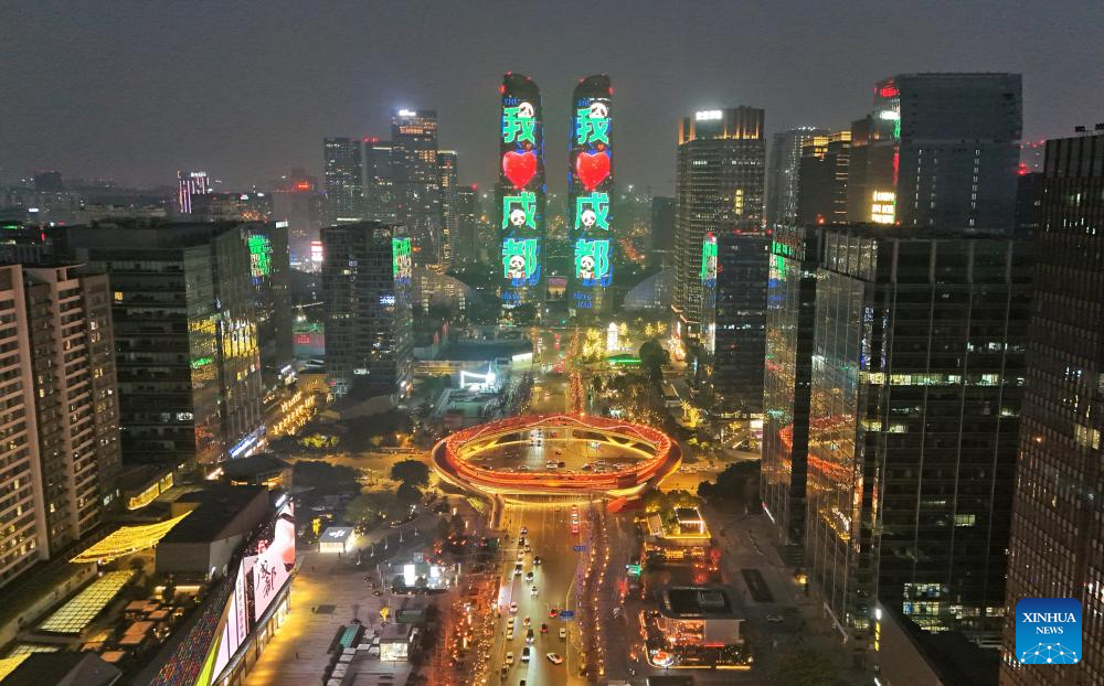 An aerial drone photo taken on Jan. 5, 2025 shows a night view of Chengdu, southwest China's Sichuan Province. The combined economic output of southwest China's Sichuan Province and Chongqing Municipality has exceeded 10 trillion yuan (about 1.44 trillion U.S. dollar) in 2025, accounting for approximately 7.2 percent of the national total. (Xinhua/Liu Kun)
