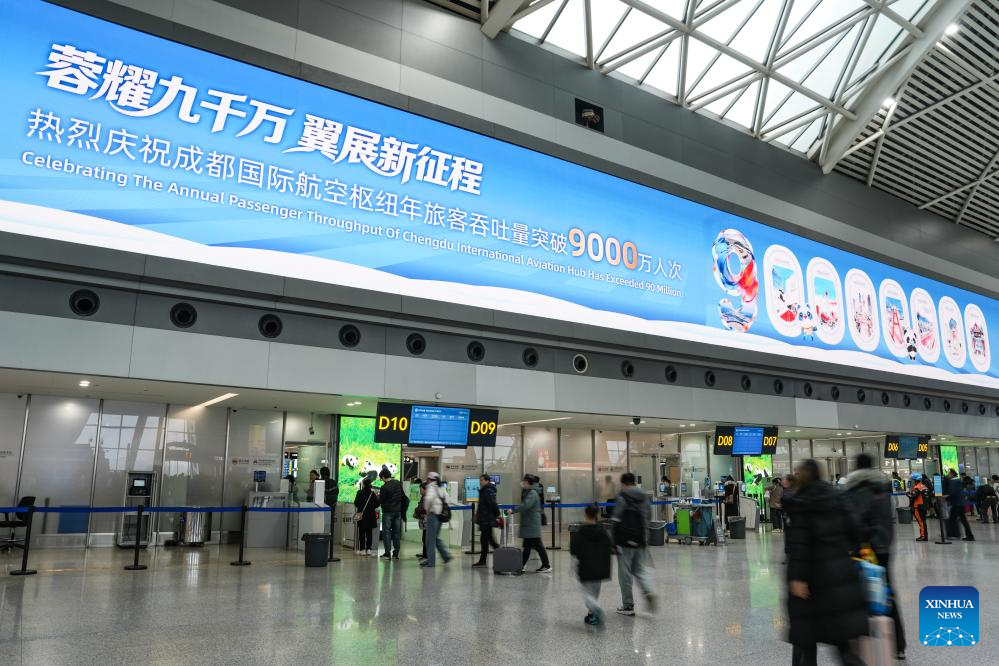 This photo taken on Dec. 31, 2025 shows a digital board displaying the annual passenger throughput of the Chengdu International Aviation Hub surpassed 90 million for the first time at Terminal 2 of the Chengdu Shuangliu International Airport in Chengdu, southwest China's Sichuan Province. The combined economic output of southwest China's Sichuan Province and Chongqing Municipality has exceeded 10 trillion yuan (about 1.44 trillion U.S. dollar) in 2025, accounting for approximately 7.2 percent of the national total. (Xinhua/Wang Xi)