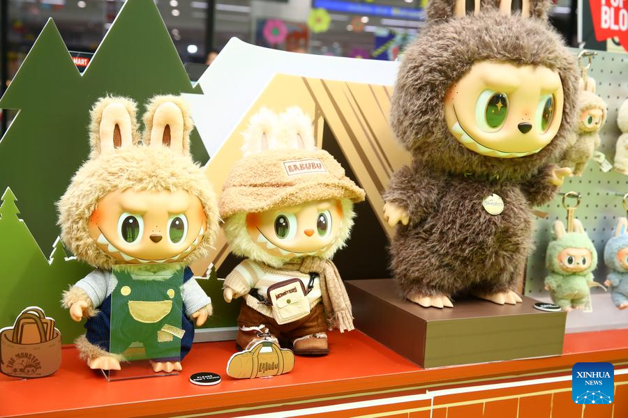 Toys themed on Labubu, a popular furry doll from Chinese toy company Pop Mart, are pictured during the opening ceremony of a new offline store of Pop Mart in Bangkok, Thailand, July 5, 2024. (Xinhua/Sun Weitong)