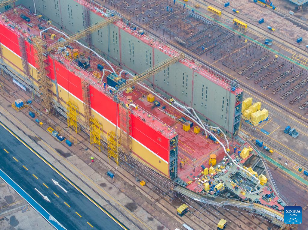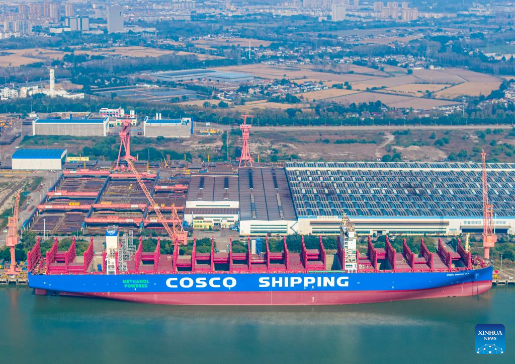 An aerial drone photo taken on Nov. 13, 2025 shows workers building a vessel at a factory of China COSCO Shipping Heavy Industry Co., Ltd in Yangzhou, east China's Jiangsu Province. Profits of China's major industrial firms returned to growth in 2025, snapping a three-year streak of declines, with emerging sectors such as equipment manufacturing and high-tech manufacturing serving as major growth drivers.