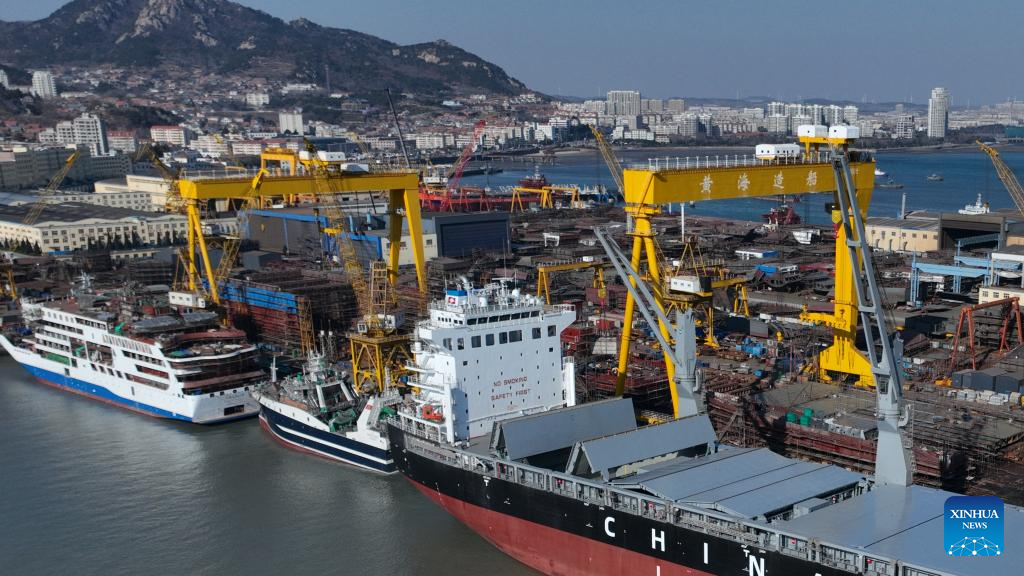 A drone photo taken on Jan. 22, 2026 shows vessels under construction at a ship building base in Rongcheng City, east China's Shandong Province. Profits of China's major industrial firms returned to growth in 2025, snapping a three-year streak of declines, with emerging sectors such as equipment manufacturing and high-tech manufacturing serving as major growth drivers.