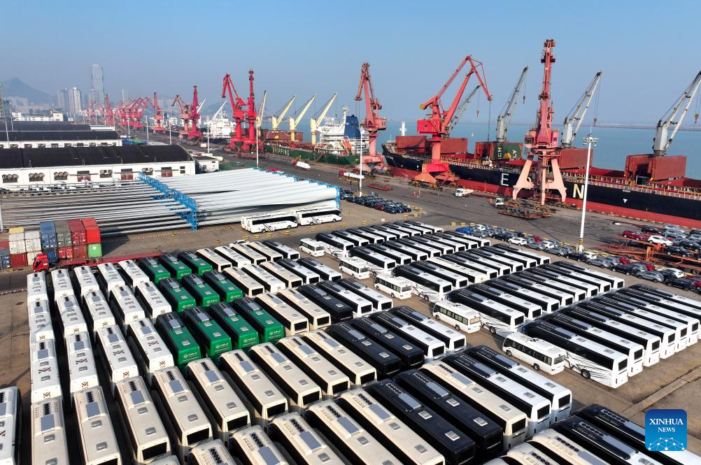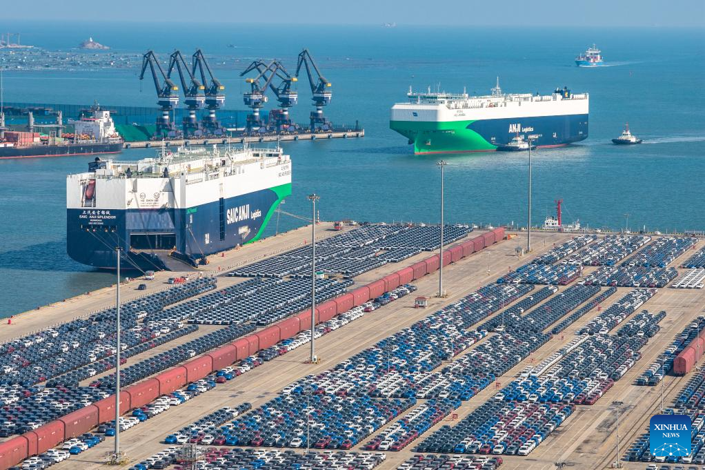 A drone photo taken on Jan. 27, 2026 shows vehicles to be loaded onto vessels at a dock in Lianyungang, east China's Jiangsu Province. Profits of China's major industrial firms returned to growth in 2025, snapping a three-year streak of declines, with emerging sectors such as equipment manufacturing and high-tech manufacturing serving as major growth drivers.