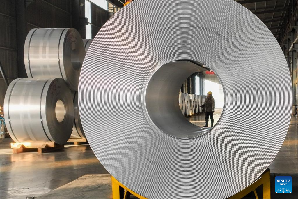 A worker lifts a roll of aluminum at a new material company in Qingyang Town, Zouping City of east China's Shandong Province, Jan. 20, 2026. Profits of China's major industrial firms returned to growth in 2025, snapping a three-year streak of declines, with emerging sectors such as equipment manufacturing and high-tech manufacturing serving as major growth drivers.