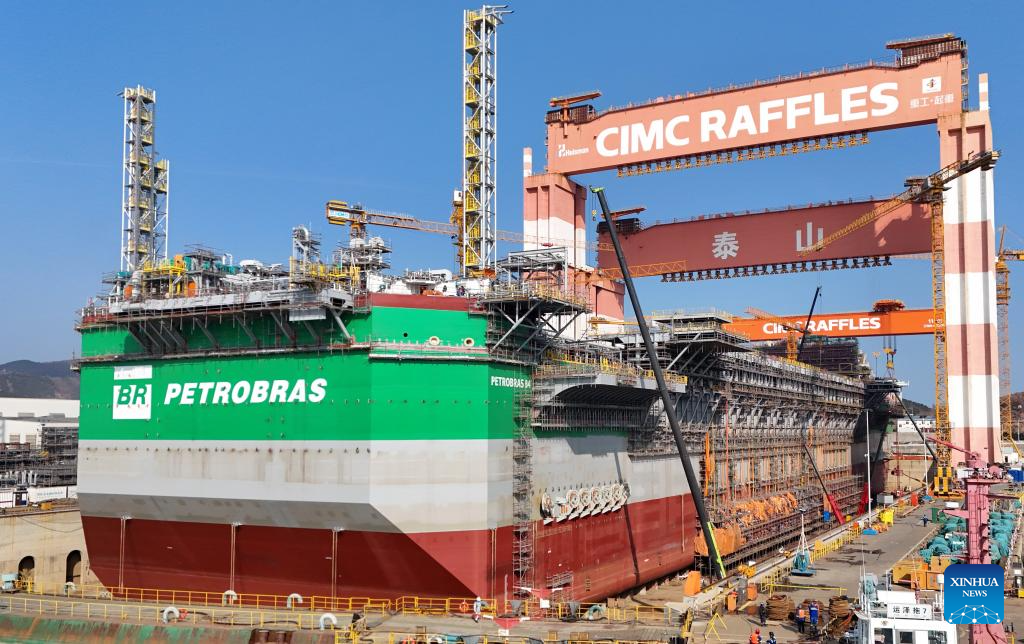 A drone photo taken on Jan. 27, 2026 shows a floating production storage and offloading (FPSO) vessel at a construction base of CIMC Raffles in Yantai, east China's Shandong Province. Profits of China's major industrial firms returned to growth in 2025, snapping a three-year streak of declines, with emerging sectors such as equipment manufacturing and high-tech manufacturing serving as major growth drivers.