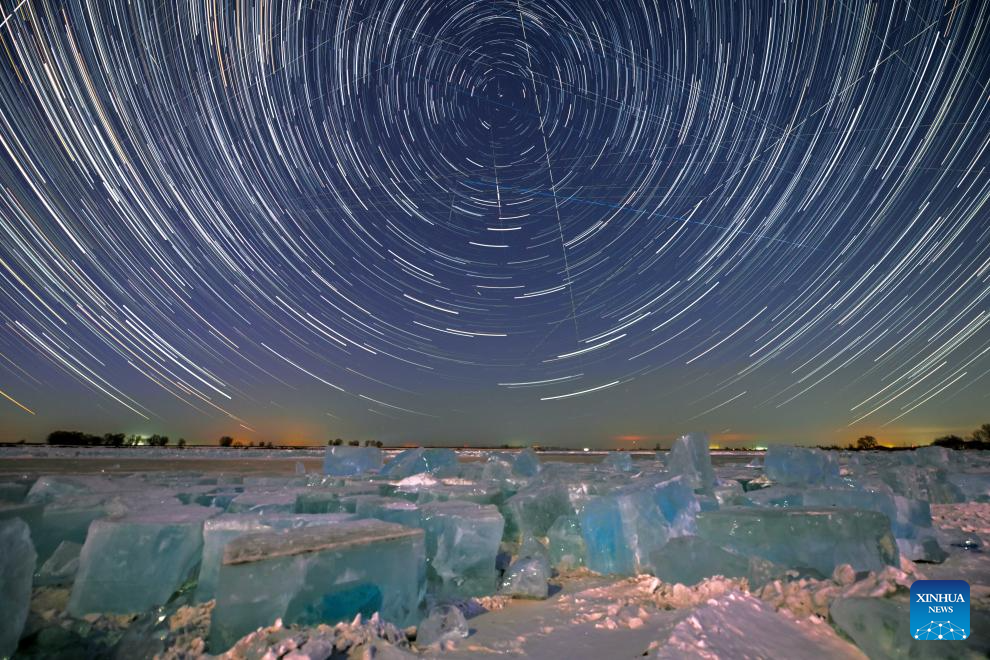 This stack composite photo taken on Jan. 27, 2026 shows a view of the starry sky in Yichun City, northeast China's Heilongjiang Province. China's northernmost Heilongjiang Province has entered the golden period for winter starry sky observation. With auroras occasionally making an appearance, the brilliant starry sky and the icy landscape together unfold a serene and breathtaking picture. (Photo by Li Jiaxing/Xinhua)