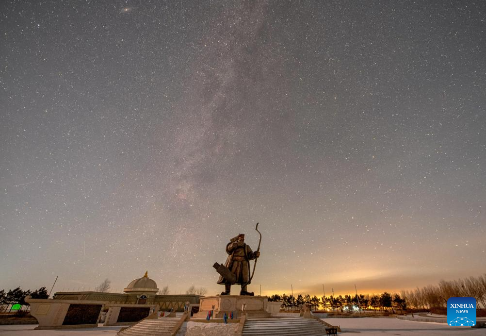 This stack composite photo taken on Jan. 23, 2026 shows a view of the starry sky in the Mongolian Autonomous County of Dorbod, Daqing City, northeast China's Heilongjiang Province. China's northernmost Heilongjiang Province has entered the golden period for winter starry sky observation. With auroras occasionally making an appearance, the brilliant starry sky and the icy landscape together unfold a serene and breathtaking picture. (Photo by Liu Wei/Xinhua)