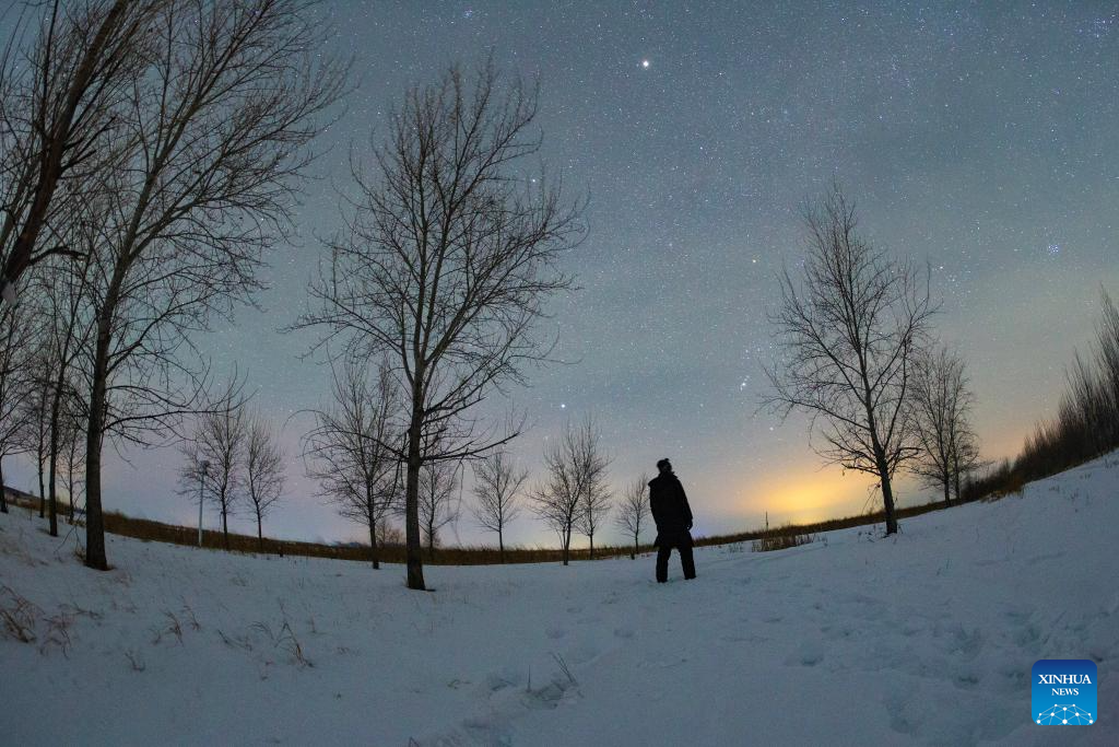 This photo taken on Jan. 18, 2026 shows a view of the planet of Jupiter and the Orion in Jiamusi City, northeast China's Heilongjiang Province. China's northernmost Heilongjiang Province has entered the golden period for winter starry sky observation. With auroras occasionally making an appearance, the brilliant starry sky and the icy landscape together unfold a serene and breathtaking picture. (Photo by Zhu Zongqiang/Xinhua)