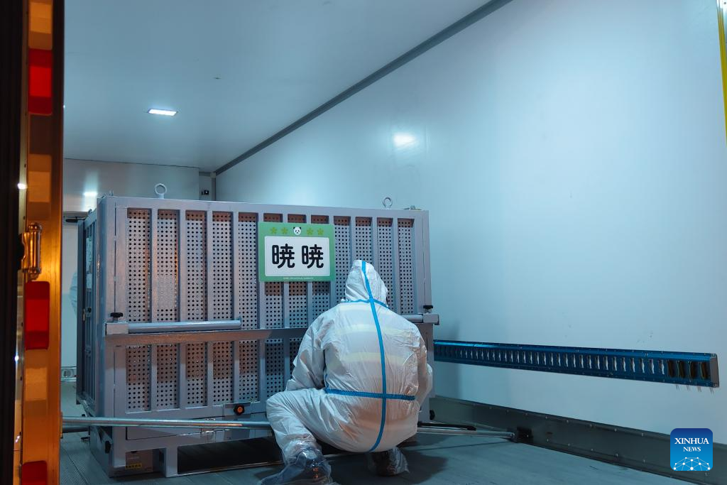 Giant pandas Xiao Xiao and Lei Lei arrive at the Ya'an base of China Conservation and Research Center for the Giant Panda in southwest China's Sichuan Province on Jan. 28, 2026.
