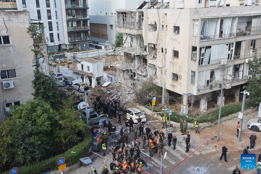 Israeli security forces and emergency responders work at the site of an Iranian missile attack in Tel Aviv, Israel, March 24, 2026. A missile fired from Iran struck Tel Aviv on Tuesday, injuring several people and damaging buildings and vehicles, Israeli authorities said. (Photo by Gil Cohen Magen/Xinhua)