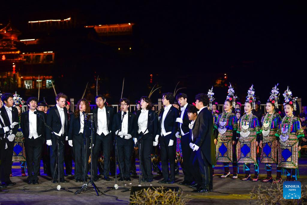 Members of the Whiffenpoofs a cappella choir of Yale University and members of a local choir sing together in Zhaoxing Dong Village of Liping County, southwest China's Guizhou Province, March 23, 2026. The Whiffenpoofs a cappella choir of Yale University visited Liping County in southwest China's Guizhou Province from March 23 to 24 for cultural exchange activities. (Xinhua/Yang Wenbin)