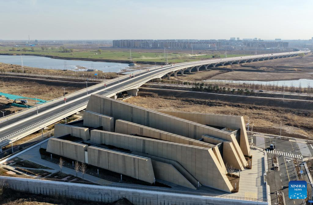 A drone photo taken on March 18, 2026 shows a view of the Duansha 110 kV substation in the Xiong'an New Area, north China's Hebei Province. The height of the park-facing side is reduced to fully integrate with the surrounding landscape. In recent years, the power grid construction in the Xiong'an New Area has been striving for higher standards and reliability. Guided by the concept of green, innovative and smart development, the Xiong'an New Area has actively developed an AI-based smart grid dispatching system using AI technology. According to State Grid Hebei Electric Power Co., Ltd, Xiong'an has now built 14 smart and green substations across multiple voltage levels. (Xinhua/Yang Shiyao)