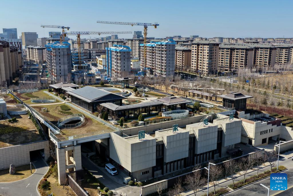 A drone photo taken on March 18, 2026 shows a view of the Jucun 220 kV substation in the Xiong'an New Area, north China's Hebei Province. The roof of this substation is covered with soil to create a park, achieving better integration with the city. In recent years, the power grid construction in the Xiong'an New Area has been striving for higher standards and reliability. Guided by the concept of green, innovative and smart development, the Xiong'an New Area has actively developed an AI-based smart grid dispatching system using AI technology. According to State Grid Hebei Electric Power Co., Ltd, Xiong'an has now built 14 smart and green substations across multiple voltage levels. (Xinhua/Yang Shiyao)