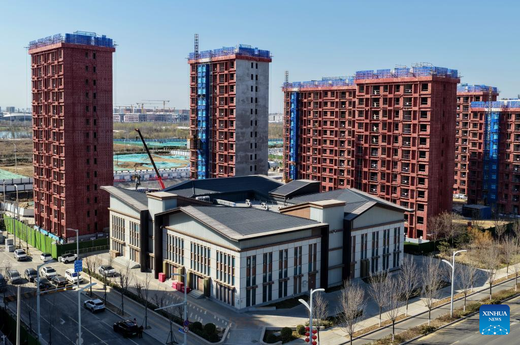 A drone photo taken on March 18, 2026 shows a view of the Hongjian 110 kV substation in the Xiong'an New Area, north China's Hebei Province. The substation is designed in harmony with the structural layout of the area, integrating seamlessly into the surrounding environment. In recent years, the power grid construction in the Xiong'an New Area has been striving for higher standards and reliability. Guided by the concept of green, innovative and smart development, the Xiong'an New Area has actively developed an AI-based smart grid dispatching system using AI technology. According to State Grid Hebei Electric Power Co., Ltd, Xiong'an has now built 14 smart and green substations across multiple voltage levels. (Xinhua/Yang Shiyao)