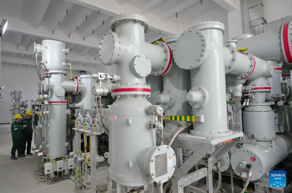 Staff members of State Grid Xiong'an New Area Power Supply Company patrol inside the Zanxi 220 kV substation in the Xiong'an New Area, north China's Hebei Province on March 24, 2026. In recent years, the power grid construction in the Xiong'an New Area has been striving for higher standards and reliability. Guided by the concept of green, innovative and smart development, the Xiong'an New Area has actively developed an AI-based smart grid dispatching system using AI technology. According to State Grid Hebei Electric Power Co., Ltd, Xiong'an has now built 14 smart and green substations across multiple voltage levels. (Xinhua/Yang Shiyao)