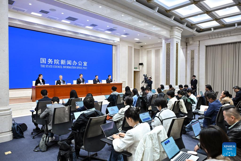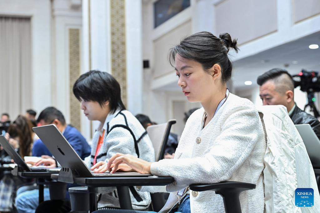 Journalists work at a press conference held by the State Council Information Office (SCIO) on achievements in civil affairs during the 14th Five-Year Plan period (2021-2025) in Beijing, capital of China, Oct. 10, 2025. Lu Zhiyuan, China's minister of civil affairs, and Li Changguan, Hu Haifeng, and Liu Zhenguo, all vice ministers of civil affairs, attended the press conference here on Friday. (Xinhua/Li Xin)