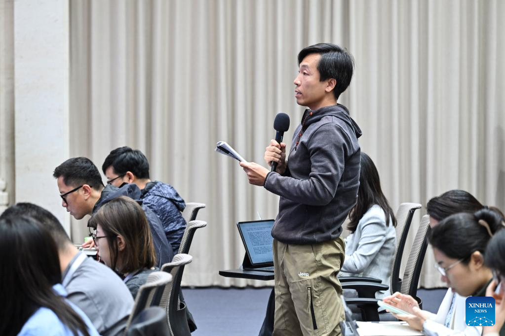 A journalist asks questions at a press conference held by the State Council Information Office (SCIO) on achievements in civil affairs during the 14th Five-Year Plan period (2021-2025) in Beijing, capital of China, Oct. 10, 2025. Lu Zhiyuan, China's minister of civil affairs, and Li Changguan, Hu Haifeng, and Liu Zhenguo, all vice ministers of civil affairs, attended the press conference here on Friday. (Xinhua/Li Xin)
