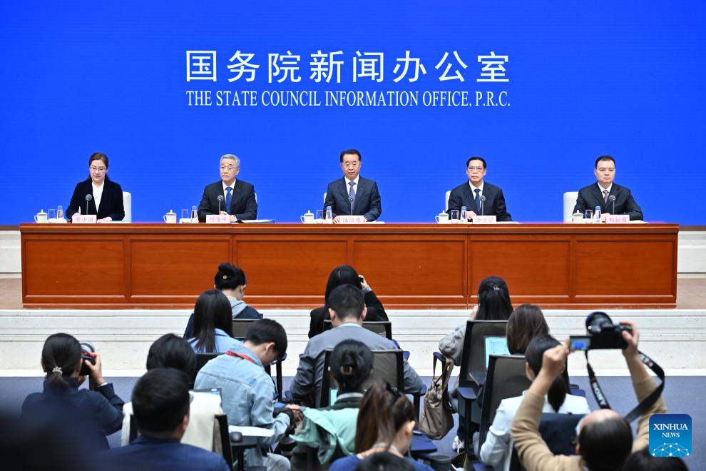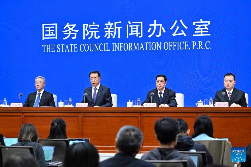 Lu Zhiyuan, China's minister of civil affairs, and Li Changguan, Hu Haifeng, and Liu Zhenguo, all vice ministers of civil affairs, attend a press conference held by the State Council Information Office (SCIO) on achievements in civil affairs during the 14th Five-Year Plan period (2021-2025) in Beijing, capital of China, Oct. 10, 2025. (Xinhua/Li Xin)