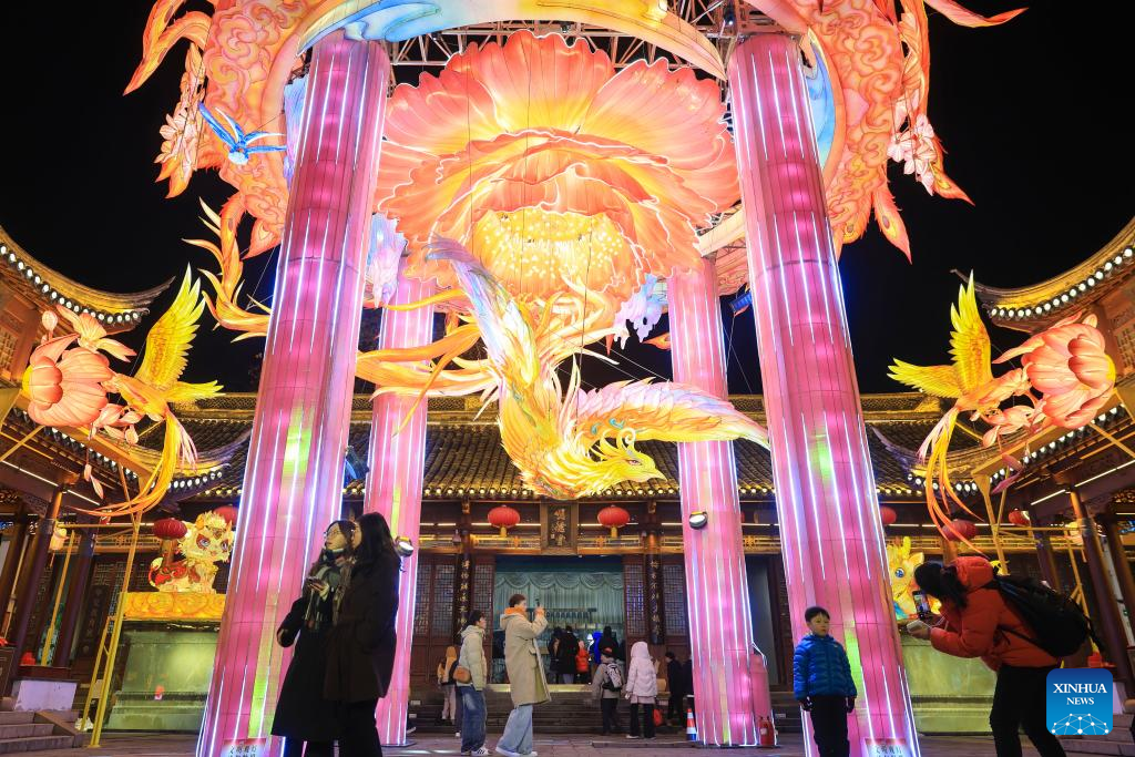 Tourists view light decorations displayed at the Confucius Temple scenic area during the 40th Qinhuai Lantern Festival in Nanjing, east China's Jiangsu Province, Jan. 21, 2026. The lighting ceremony of the festival was held at the Bailuzhou Park on Wednesday. The festival can be visited in several exhibition areas near the Qinhuai river in the city of Nanjing. (Photo by Liu Jianhua/Xinhua)