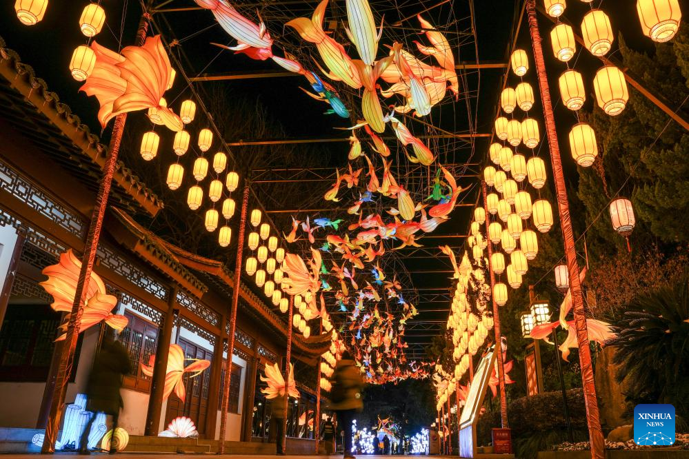 This photo taken on Jan. 21, 2026 shows light decorations displayed at the Bailuzhou Park during the 40th Qinhuai Lantern Festival in Nanjing, east China's Jiangsu Province. The lighting ceremony of the festival was held at the Bailuzhou Park on Wednesday. The festival can be visited in several exhibition areas near the Qinhuai river in the city of Nanjing. (Xinhua/Li Bo)