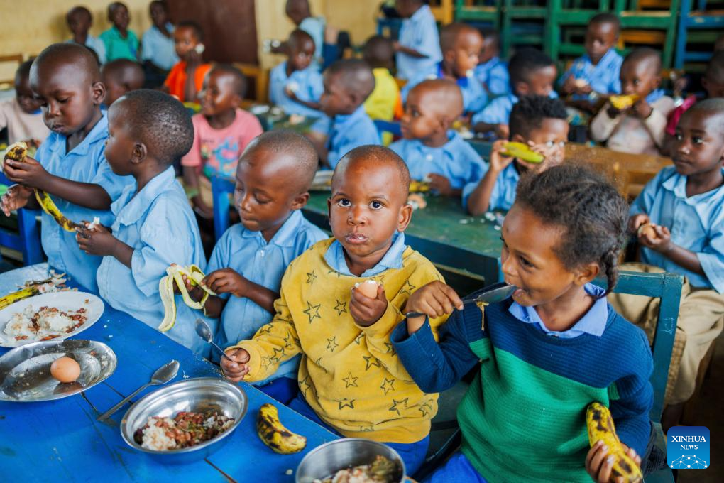 Children have lunch at their classroom at a school in Bugesera District, Eastern Province in Rwanda, on Jan. 20, 2026. Under a children-supporting program launched in 2023, children here are offered meals in schools to address their nutrition problems. (Photo by Cyril Ndegeya/Xinhua)